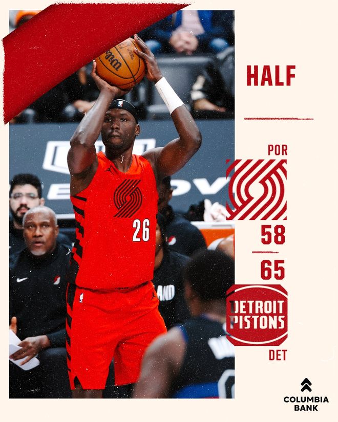 活塞队的杜伦上半场得到16分和6个篮板,坎宁安得到13分和5次助攻;开拓者队的阿夫迪亚得到19分、4个篮板和4次助攻,格兰特得到15分,夏普得到10分和4个篮板。
